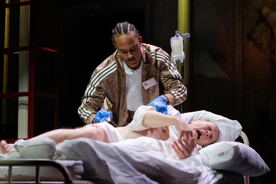 Roy Cohn (Timo Tuominen) kärsii ja hoitaja (Leo Ikhilor) auttaa hädässä.